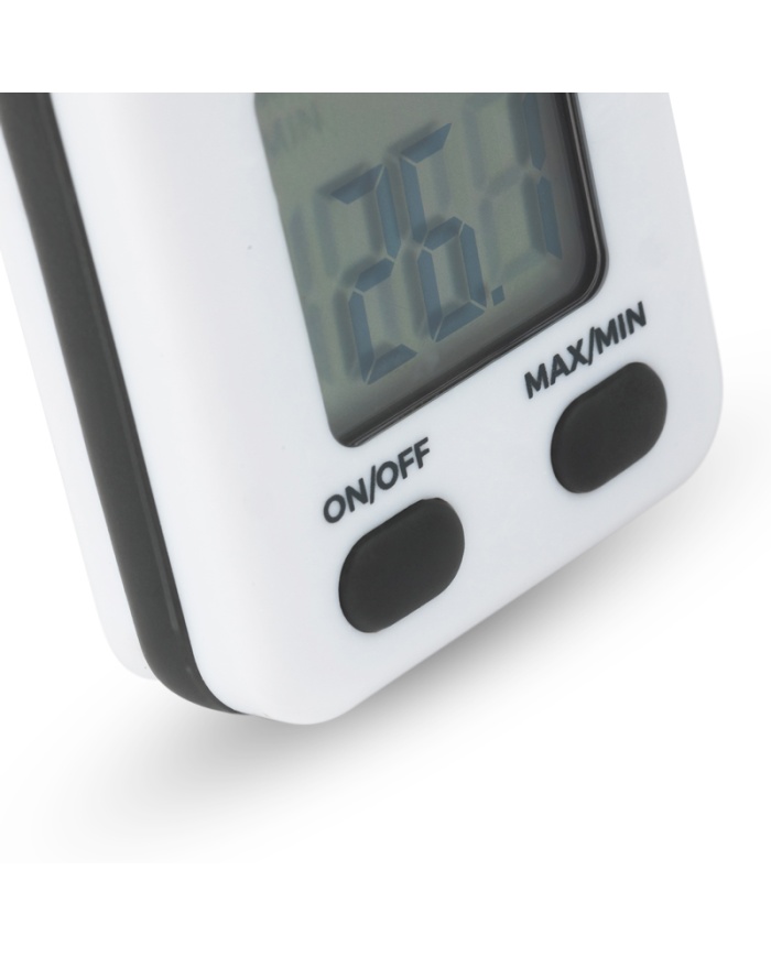 Termometeret måler temperaturer i området -9,9 til 49,9°C med en præcis opløsning på 0,1°C. Det kan enten være fritstående eller hænges fra en hylde i dit køleskab, hvilket giver fleksibilitet i placering for optimal temperaturovervågning. Dette essentielle værktøj hjælper med at sikre, at dine kølede fødevarer opbevares ved sikre temperaturer, hvilket reducerer risikoen for fødevarebårne sygdomme.