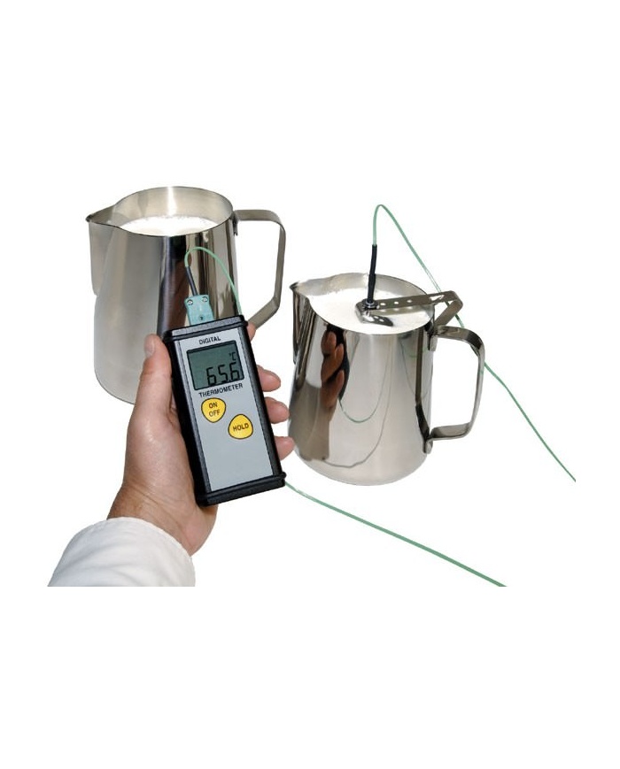 Termometerprobeklemmer – Disse sondeholdere i rustfrit stål sidder fast på toppen af en kande eller lignende for at holde en temperatursonde på plads. To modeller er tilgængelige, den ene accepterer enten en Ø3 eller Ø3,3 mm sondestamme og den anden er designet til at fungere sammen med et bimetaltermometer og acceptere en Ø4 mm sondestamme. For at sikre maksimal nøjagtighed ved aflæsning bør sonden ikke røre bunden eller siderne af beholderen.
