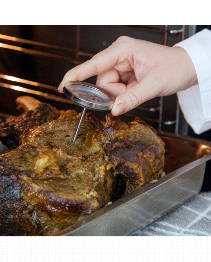 For nøjagtig temperaturmåling skal termometerstammen indsættes i den tykkeste del af kødet eller fjerkræet. Skiven indeholder farvekodede markører til oksekød, lam, svinekød og fjerkræ for hurtig og nem aflæsning.