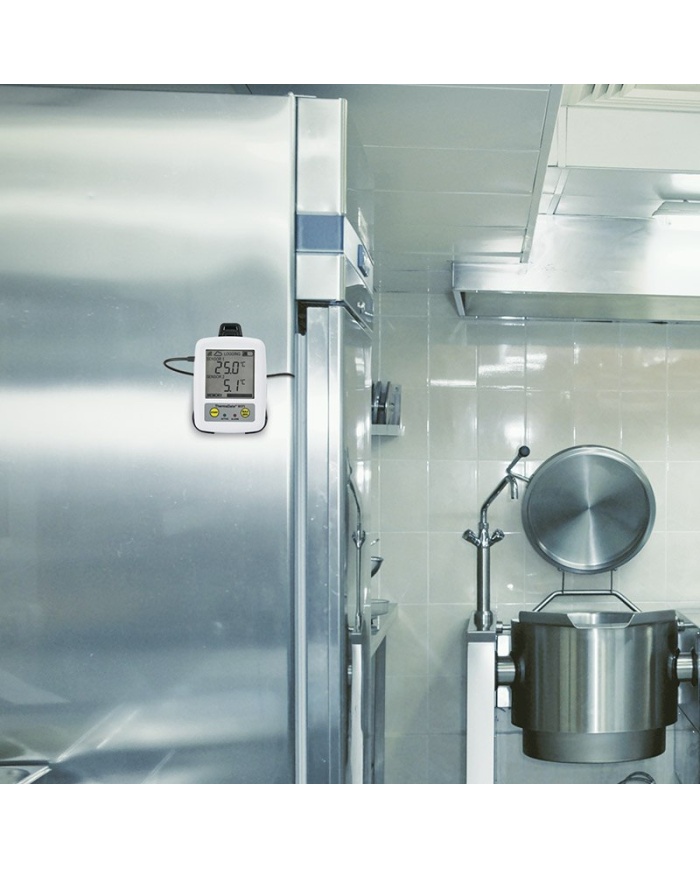 ThermaData TD1F temperaturdatalogger har to sensorer: en intern temperatursensor og en ekstern indtrængningssensor. Sæt enheden på ydersiden af et køleskab/fryser for at overvåge stuetemperaturen, og placer den eksterne sonde inde i køleskabet for at registrere nedkølede produkttemperaturer.