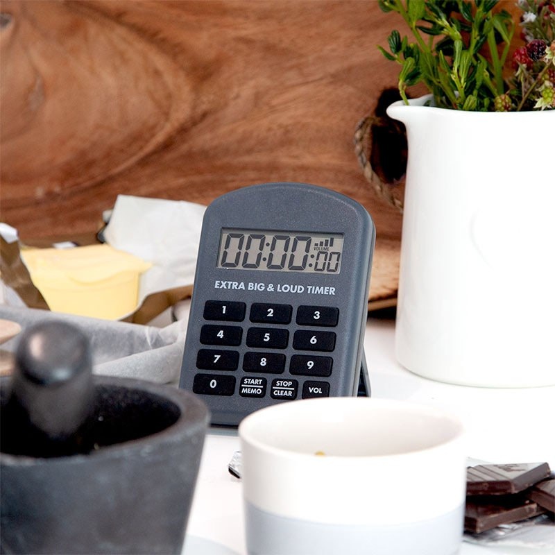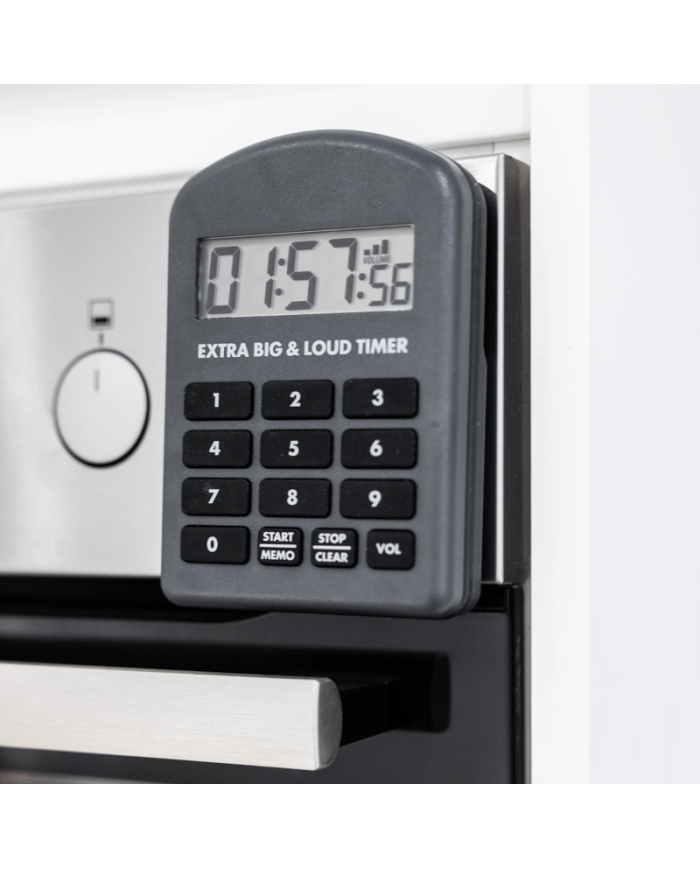 Extra Big and Loud timeren er en køkken- og madlavningstimer, der har robust hus og er vandtæt op til IP65, har variabel volumenkontrol, så brugeren kan indstille op til et maksimalt volumen på 110 decibel – perfekt i travle professionelle køkkener.