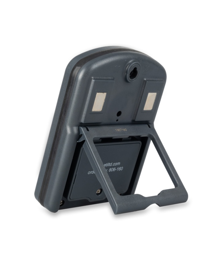 Når en nedtællingsalarm lyder, starter nedtællingstimeren, så du kan se, hvor lang tid det vil tage, efter at din alarm er blevet indstillet. Hukommelsen bevarer din sidste nedtællingsindstilling. Timeren indeholder to magnetiske puder, et udfoldeligt stativ. Timeren måler 28 x 90 x 130 mm og drives af et 9 volt PP3-batteri.